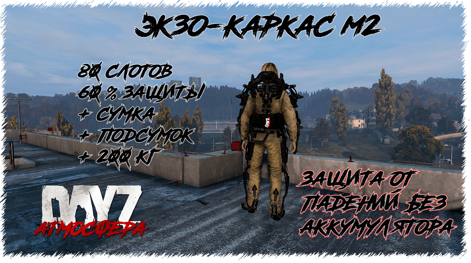Состав: экзо-жилет выживальщика (100 слотов), куртка выживальщика (80 слотов), экзо-пояс выживальщика (100 слотов), штаны выживальщика (80 слотов), капюшон выживальщика, перчатки выживальщика, ботинки выживальщика. Защита от заражения 100%, грузоподъемность 145 кг.